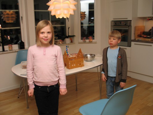 Helsta ósk Einars á afmælisdaginn var að gera piparkökuhús með Maríu og Huga. Við hringdum því í ömmu á Sóló sem gaf okkur uppskriftina og málin að sínu húsi. Hér er allt komið saman nema þakið og systkinin stolt af afrakstrinum.
