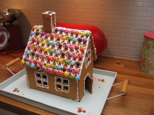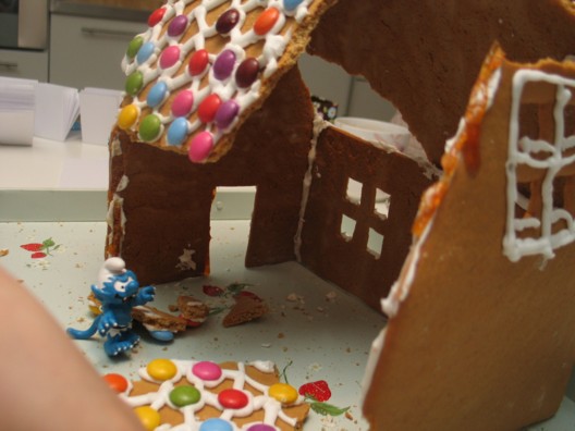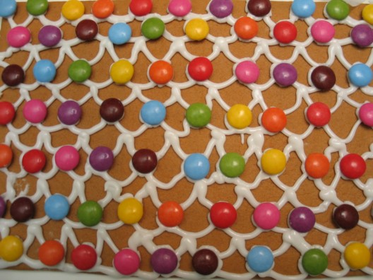 Mitt eina framlag til hússins var að skreyta þakið en það dugði samt til þess að mér tókst næstum að klúðra öllu! Ég setti nefnilega ofgnótt af smartís á plöturnar og þær urðu svo þungar að illa gekk að líma þær á grindina auk þess sem hún brast undan öllum þunganum þegar loks tókst að setja þakið á!