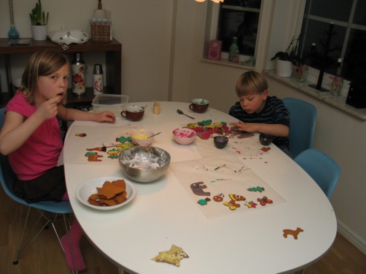 María, Hugi og Einar skreyttu svo piparkökurnar sem bakaðar voru úr afgangnum af piparkökuhúsinu. Húsfreyjan var hins vegar fjarri góðu gamni þar sem hún sat við frá morgni til kvölds til að reyna að ljúka við allar handgerðu jólagjafirnar (sjá næsta albúm!).
