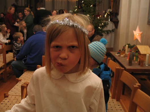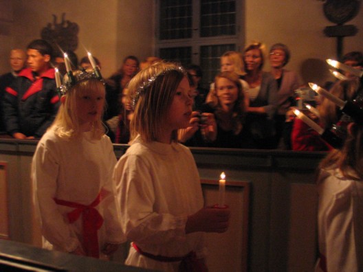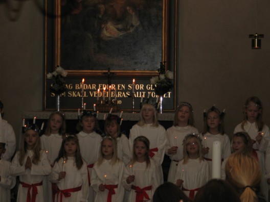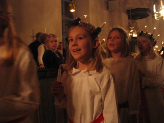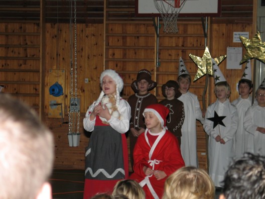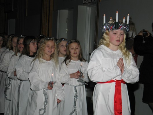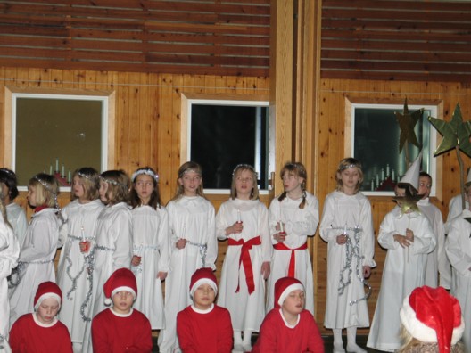Það er hefð fyrir því í Vänge skola að 2. bekkur sjái um Luciuhátíðina. Í ár var því komið að Maríu og félögum og við foreldrarnir fengum að koma og horfa á þau lussa að morgni 12. desember. Hér er „tågað“ inn í leikfimisalinn.