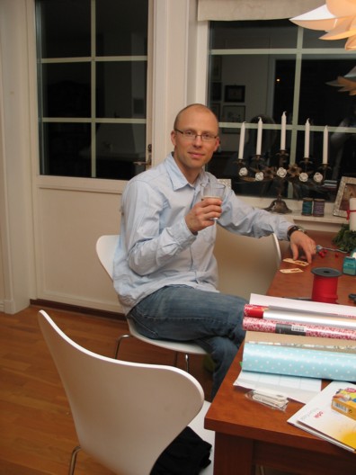 Við Einar skáluðum í jólapilsner meðan við pökkuðum inn síðustu gjöfunum og létum okkur hlakka til Íslandsdvalarinnar.
