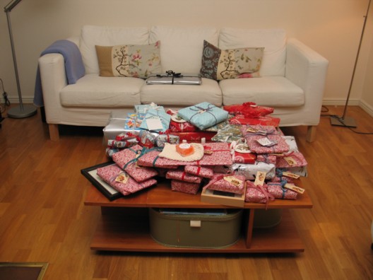 Kvöldið fyrir brottför til Íslands var ástandið í stofunni svona! Auk allra jólagjafanna fluttum við með okkur tvær síðbúnar afmælisgjafir, eina brúðargjöf og eina sængurgjöf!
