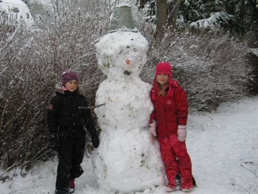 Fyrstu helgina í febrúar snjóaði dálítið hjá okkur og á sunnudagsmorgninum var allt hvítt og óskaplega fallegt. María og Tilda vinkona hennar nýttu tækifærið og reistu risa snjókarl fyrir aftan hús hjá okkur. Snjórinn var hins vegar að mestu horfinn daginn eftir og snjókarlinn dottinn beint á fína gulrótarnefið!