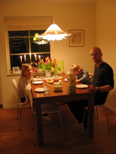 Samkvæmt fjölskylduhefð bakaði Einar vatnsdeigsbollur á bolludaginn. Hér er fjölskyldan samankomin við borðstofuborðið en flassið varð hins vegar eftir uppi á lofti og fókusinn eftir því!