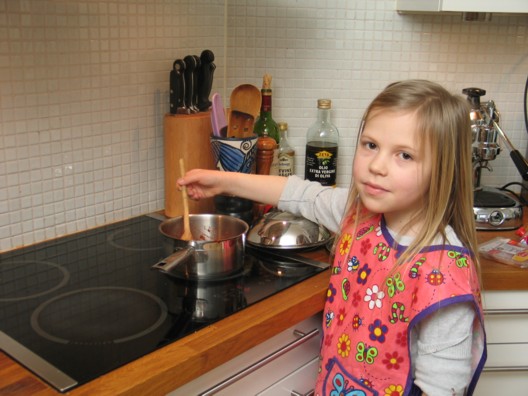 María fékk krakkamatreiðslubók í jólagjöf og hefur verið iðin við að baka og elda síðan. Hér er hún að baka pizzur í hádegismatinn handa okkur einn sunnudaginn.