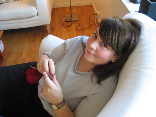 Húsmóðirin sat hins vegar í húsmóðurstólnum og sinnti hinu ofurleiðinlega verkefni að prjóna prjónfestuprufu! (Ég vildi óska þess að ég hefði líka verið klippt síðar þennan sama dag!!!)