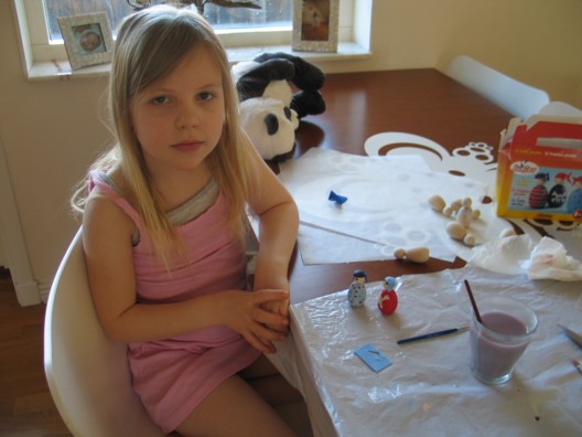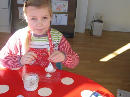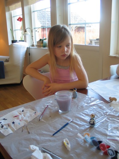 María enn í sportleyfi, enn veik og enn að föndra! Hér er hún nánartiltekið að steypa úr gifsi sem hún málaði svo og bjó til ísskápssegla, nælur og styttur úr.