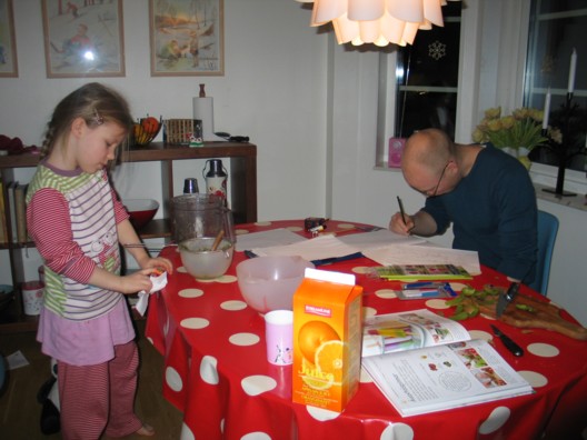 Hver að sýsla sitt við eldhússborðið. María útbýr frostpinna eftir uppskrift úr bókinni sinni góðu og Einar þykist vera landslagsarkitekt og teiknar upp lóðina okkar!