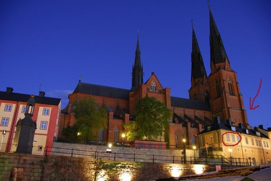 Að lokum má ég svo til með að setja hér inn eina mynd sem ég bæði stal af netinu og eyðilagði svo með því að krassa inn á hana! Þetta er sumsé dómkirkjan í Uppsölum, sú stærsta á öllum norðurlöndum. Og þarna í litla, gamla, gula og krúttlega húsinu er æfingasalur kórsins míns (og allara hinna kóranna við kirkjuna). Mér þykir eitthvað svo ótrúlega gaman að eiga smá hlutdeild í kirkjunni og svæðinu í kringum hana. Þetta er elsti hluti borgarinnar og þar er mýgrútur af sögufrægum húsum. Gula húsið með æfingasalnum er meira að segja dálítið frægt því á því Ingmar Bergman notaði hluta af framhlið þess sem leikhúsið í Fanny og Alexander!