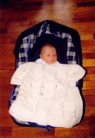 María vikugömul með teppið sem Þórunn móðursystir og guðmóðir prjónaði handa henni!