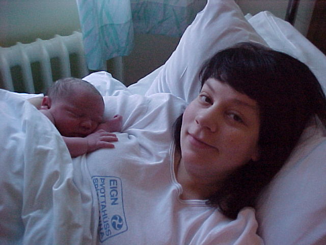 Og þarna erum við mæðginin sameinuð á ný eftir skamma dvöl í hitakassa og á vöknun! Takið sérstaklega eftir eyrnasneplinum sem flest út á öxlinni á Huga!!!
