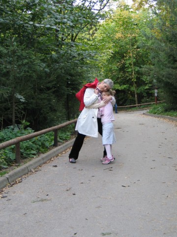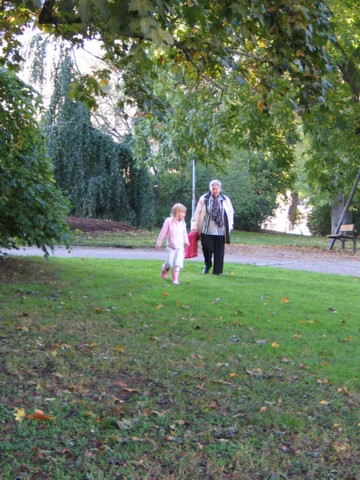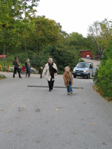 Hugi og amma á Sóló koma hlaupandi eftir stígnum! Það var reyndar töluverð bílaumferð um þenna hluta Skansins þar sem brúðkaup fór fram í Seglora kirkjunni á þessari stundu.