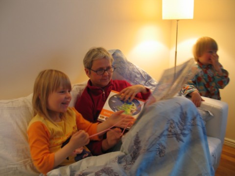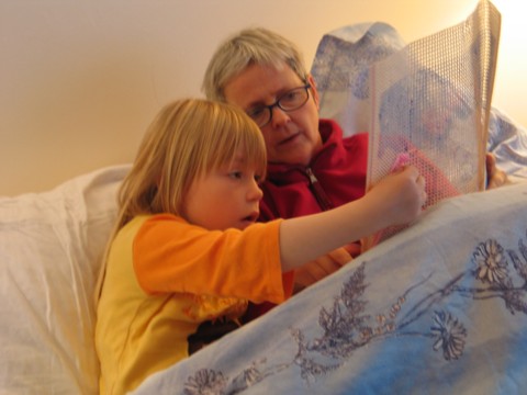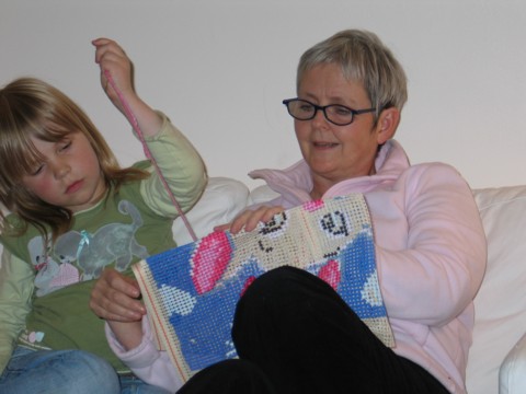 María og Hugi voru ákaflega glöð að vakna á föstudagsmorgninum og finna tvær ömmur í stofunum! Imba amma hafði komið með rosalega fínt krossaumsdót handa Maríu sem féll heldur betur í kramið. Stelpan stakk sér undir sæng hjá ömmu og saumaði með henni fram eftir morgni!