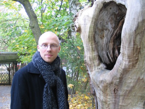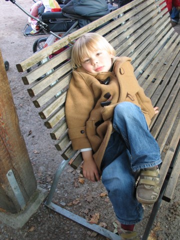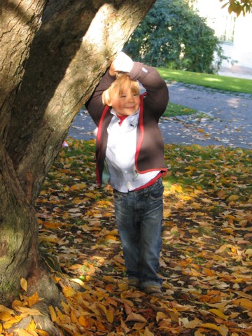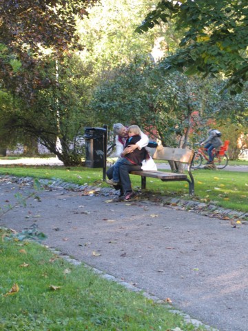 Eftir að dómkirkjan hafði verið skoðuð í krók og kring lögðum við leið okkar í háskólagarðinn. Þegar þessi mynd var tekin var Hugi reyndar enn að jafna sig eftir sýningu sem við sáum fyrir utan kirkjuna þar sem tvær manneskjur á stultum léku galdrakarl og norn. Hann varð svo hræddur að hann hágrét þangað til flúið var með hann í öruggt skjól bak við næsta hús. Þá óx honum hins vegar skyndilega ásmeginn og þóttist mest sjá eftir því að hafa ekki bara verið með sverðið sitt í bænum því þá hefði hann barist við nornina!
