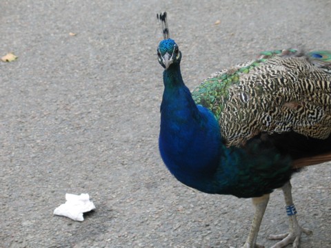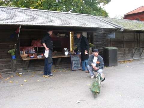 Nokkrir tíugulegir páfuglar spranga um á Skansen.
