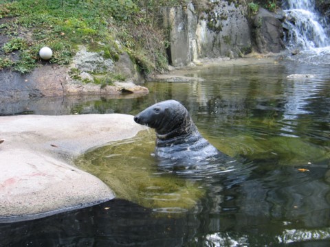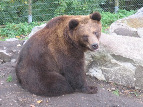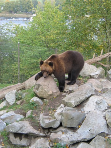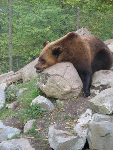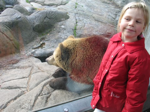Bjarnargryfjan er ein helsta perla staðarins. Svæðið þeirra er risastórt og ótrúlega flott. Þrátt fyrir víðáttuna valdi þessi bangsi að fá sér blund klesstur upp við glerið sem skilur milli gryfjunnar og æstra áhorfenda! Maríu fannst gaman að skoða bangsann í návígi ...
