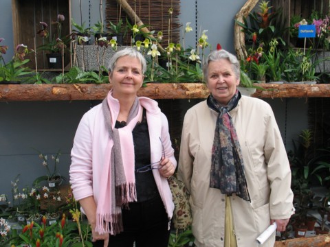 Mæðgurnar með ýmsar gerðir af orkideum á bak við sig.