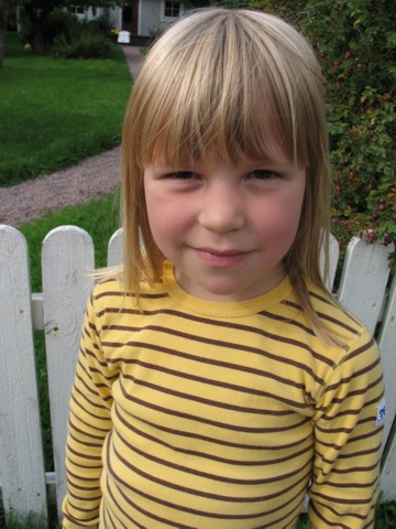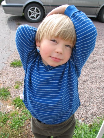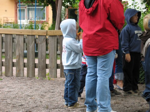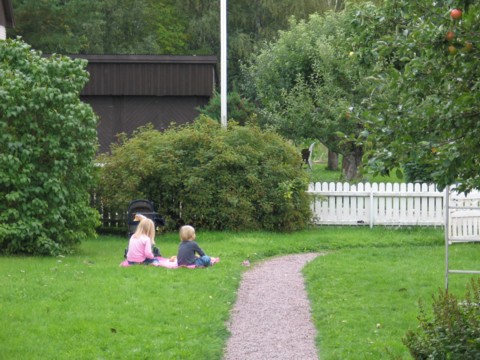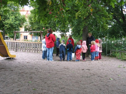 Mánudaginn 4. september byrjaði Hugi í leikskóla, nánar tiltekið Hemmingsförskolan í Luthagen hverfinu. Við erum öll geypilega ánægð með þennan leikskóla og förum þangað glöð á hverjum morgni þótt við þurfum að keyra dálítinn spotta. Þarna er Hugi í fyrstu ávaxtastundinni sinni undir trjánum í garðinum. Hann er þessi í ljósbláu hettupeysunni lengst til vinstri.