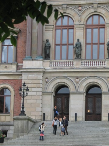 Skyldu þessi hafa verið að breyta skráningunni sinni? Kannski var bara búið að loka Nemendaskránni eða þá að biðröðin hefur verið svo löng (eins og gjarnan vill gerast í upphafi annar) að þau hafa hrökklast frá? Kannski er þessi í hvítu peysunni að segja við hin: Hey, hittumst á Kaffi Kúk eftir tuttugu mínútur, ég þarf aðeins að skreppa! Skyldi yfirhöfuð vera til Kaffi Kúkur í Uppsalaháskóla? Aðalbyggingin ber það alla vega ekki með sér!