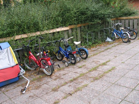 Hér hjóla allir, menn, konur ... og börn! Svona lítur hjólastæðið fyrir utan leikskólans hans Huga út á hverjum degi!
