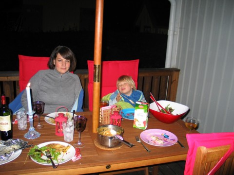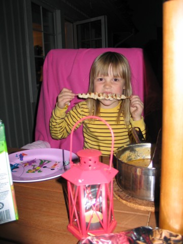 Eftir þessa rosalegu bíl- og búðarferð varð auðvitað að elda eitthvað gott úr öllum varningnum. Við ákváðum að halda síðustu útigrillveislu sumarsins enda vorum við nokkuð sannfærð um að tækifærum til slíks færi óðum fækkandi (við reyndumst ekki sannspá og erum búin að grilla úti nokkrum sinnum síðan!). Boðið var upp á hressandi kjúklingaspjót með unaðslega góðri satay hnetusósu. Spjótin féllu í góðan jarðveg hjá systkinunum ...