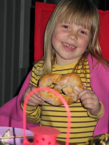 María með sykurkringlu sem hún er sannfærð um að Abbi úr Maddittarbókunum hafi bakað!