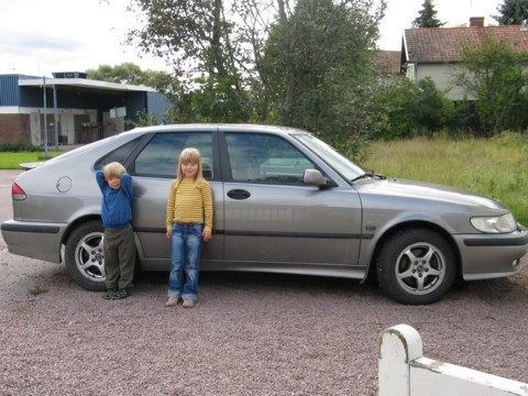 Þrátt fyrir allar hjólreiðarnar ákváðum við að fjárfesta í nýjum bíl! Þennan stórglæsilega Saab 9-3, árgerð 2001, keyptum við okkur snemma í september. Öll fjölskyldan gladdist ósegjanlega mikið og það fyrsta sem við gerðum var að fara í rækilega búðarferð (þið munið hvernig þær fóru í öllu bílleysinu). Svo mikil var gleði okkar yfir að geta verslað eins og við vildum að í fyrstu búðarferðinni keyptum við vörur fyrir 23 þúsund íslenskar krónur!!! Reyndar segir það kannski meira um slakt ástand ísskápsins í bílleysinu en verslunargleði fjölskyldunnar!!!