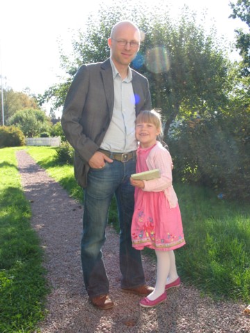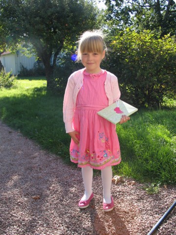 Maríu var boðið í afmæli til bekkjarsystur um daginn og þangað fór hún fín og sæt með pakka! Pabbinn keyrði hana fram og til baka en skvísan stóð sig eins og hetja ein og óstudd í afmælinu. Hún er aðeins farin að spreyta sig aðeins á að tala sænsku og í afmælinu hafði hún til að mynda sagt við eina stelpu sem henni fannst í glæsilegum sparikjól: „Du är jättefin!“ Hún er dugleg þessi stelpa ... og jättefin sjálf!