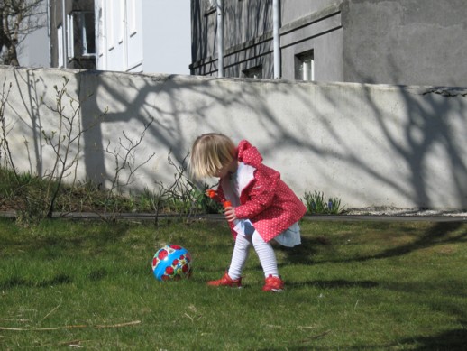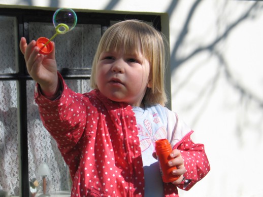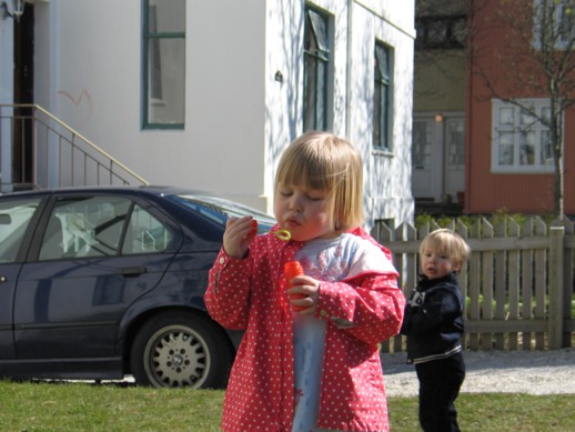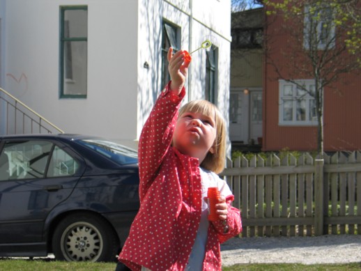 Við fögnuðum sumarkomunni að sjálfsögðu og nutum veðurblíðunnar líkt og aðrir landsmenn. María og Hugi byrjuðu á að fara út í garð og blása sápukúlur. Hugi missti reyndar fljótt áhugann enda fannst honum mun meira spennandi að hella sápukúluleginum niður en María blés kúlur af miklum móð og reyndist meira að segja ansi snjöll í að veiða þær aftur.