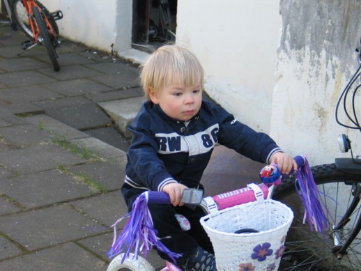 Hugi fékk að prófa hjólið hennar Maríu enda hafði hann ekki nokkurn minnsta áhuga á sínu eigin, splunkunýja þríhjóli! Full barnalegt fyrir hans smekk!!!