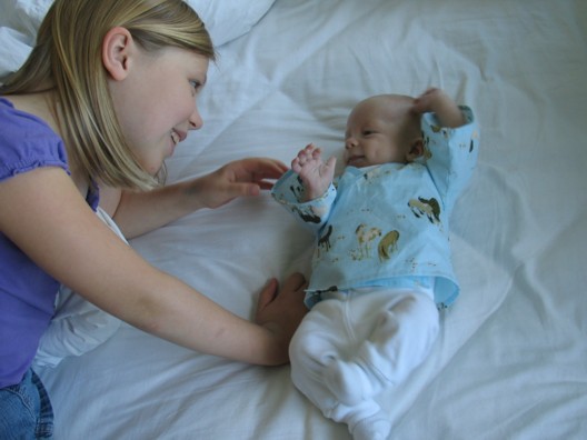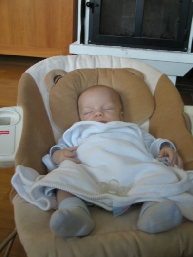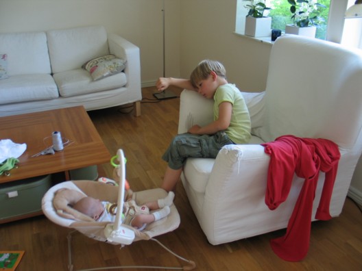Hugi er afskaplega duglegur og ábyrgðarfullur stóri bróðir. Sá litli má varla pípa án þess að hann sé mættur til að rugga, halda í höndina á eða segja „svona svona“ og oft þykir honum við foreldrarnir heldur sveifasein og kærulaus! Hér er hann að rugga litla bróður í ömmustólnum með fætinum.