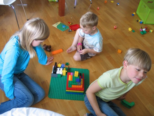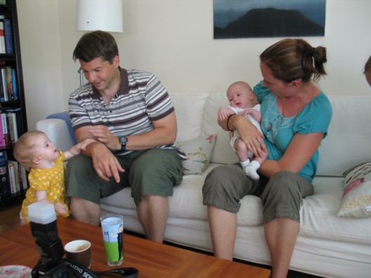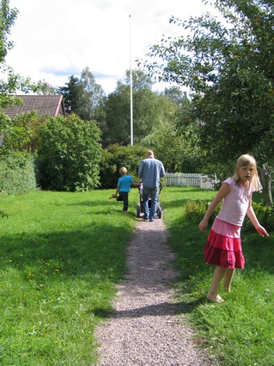 Um daginn fengum við góða gesti frá Stokkhólmi þegar Alfreð, Björk, Pétur og Áslaug Margrét komu í heimsókn. Hér er Pétur að leika við Maríu og Huga og mátti vart á milli sjá hver naut sín best, hann að fá að leika við svona stóra krakka eða þau að fá að ráðskast með svona lítinn strák!