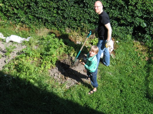 Á meðan voru feðgarnir úti að taka upp kartöflur í sólinni. Við fengum því miður ekki sömu gerð af útsæði og í fyrra (ástarkartaflan Cherie sem var hrein upplifun að borða) en það sem kemur undan grösunum er samt afskaplega ljúffengt, sérstaklega með bráðnu smjöri og salti!