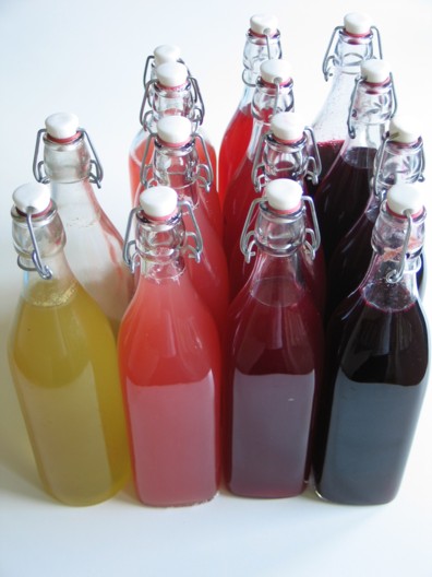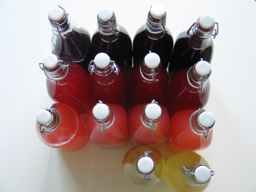 Ársins 2009 verður sennilega minnst hér á Konsulentvägen sem saft ársins mikla (já og auðvitað ársins sem litlinn okkar fæddist!). Við erum búin að setja á flöskur 16 lítra af safti sem gerir þá um 60-80 lítra af tilbúnum drykk (fer svolítið eftir hversu sterkt maður blandar). Úr einhverjum flöskum höfðum við nú klárað þegar þessi mynd var tekin og einhverjar voru inni í ísskáp svo þetta er ekki einu sinni allt. Á myndinni eru þó allar tegundirnar, frá vinstri: flädersaft, rabarbarasaft, rifsberjasaft og sólberjasaft.