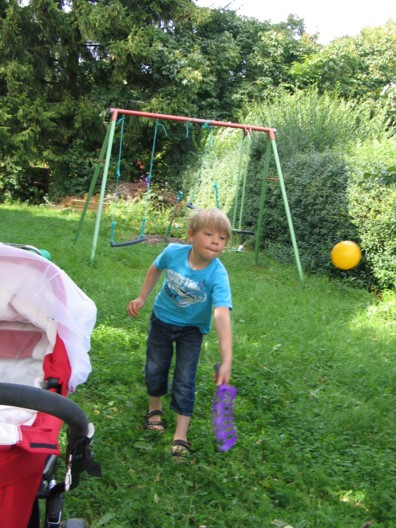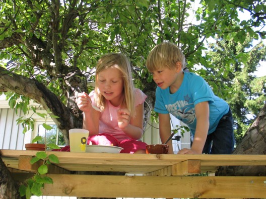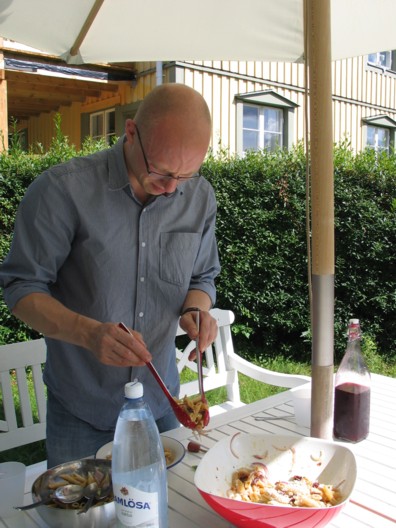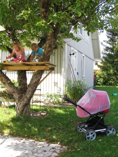 Nú virðist myggfaraldurinn loksins vera í rénum og við borðuðum hádegisverð úti á stétt í fyrsta sinn síðan í byrjun maí! Systkinin kusu reyndar að snæða sitt pastasalat í tréhúsinu og sjást hér angistarfull yfir lítilli flugu sem festist í dressingunni þeirra!