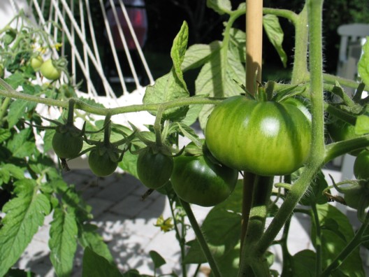 Tómatarnir okkar eru óðum að þroskast þrátt fyrir að þeim hafi verið plantað heldur seint.