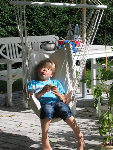 Hér er Hugi búinn að tína sér epli af trénu sem hann maular meðan hann rólar sér í hengistólnum og hugsar um lífið og tilveruna.
