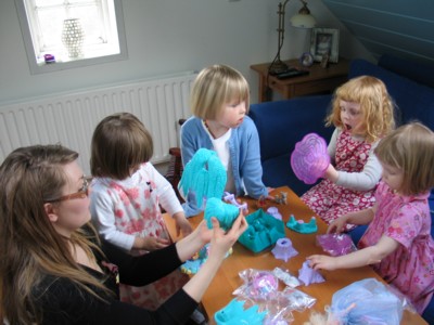 Svanaprinsessudótið var án efa vinsælasta gjöfin. Hér sjást flestallar ungfrúrnar í afmælinu uppteknar af að setja það saman. Takmarkalaus aðdáunin leynir sér ekki!