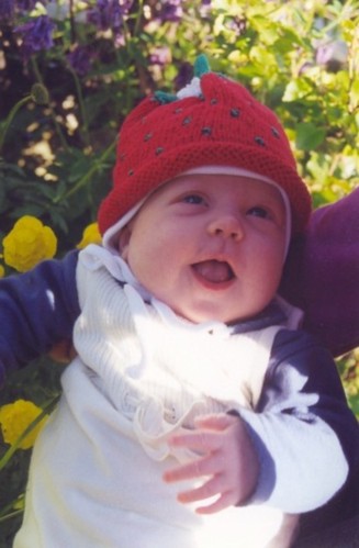 María vikugömul með teppið sem Þórunn móðursystir og guðmóðir prjónaði handa henni!
