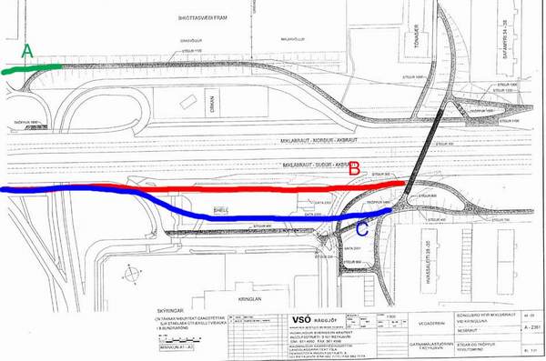 leið að gatnamótum Kringlumýrarbrautar - Miklubrautar.