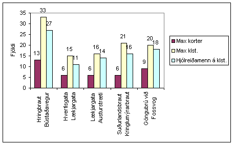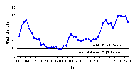 | Flestir hjólreiðamenn voru taldir á gatnamótum Hringbrautar og Bústaðavegar, 53 á þeim tveimur klukkustundum sem voru taldar. Það eru að meðaltali 27 hjólreiðamenn á klukkustund en stærsta klukkustundin innan þessara tveggja tíma voru 33 hjólreiðamenn. Á þessum sömu gatnamótum má ætla að séu milli 60 - og 70 þúsund ökutæki á sólarhring.Síðari talningin var fimmtudaginn 28. september síðastliðinn. Þá voru taldir hjólreiðamenn á gatnamótum Miklubrautar og Kringlumýrarbrautar. Þann dag var yndislegt haustveður, bjart og stillt, hiti 4 - 13° yfir daginn. Það er styðst frá því að segja að 320 hjólreiðamenn töldust á gatnamótunum yfir daginn, flestir 50 á einni klukkustund, en það gerðist þrisvar síðdegis. |